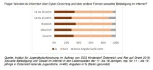 56% der Studienteilnehmer wissen nicht, dass Cyber-Grooming in Österreich strafbar ist. Viele wurden nie über die Gefahren des Internets informiert (s. Grafik). Die befragten Kinder und Jugendlichen wünschen sich insgesamt mehr Aufklärung zu den in der Studie besprochenen Themen. Sie erachten es für sinnvoll, damit möglichst schon in jungen Jahren zu beginnen.